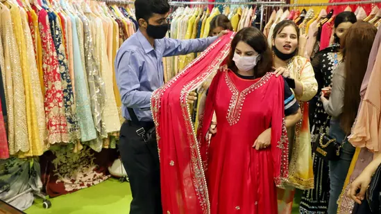 A woman tries a red salwar suit at a stall selling Indian attires at the 40th India International Trade Fair at Pragati Maidan in New Delhi.(ANI)