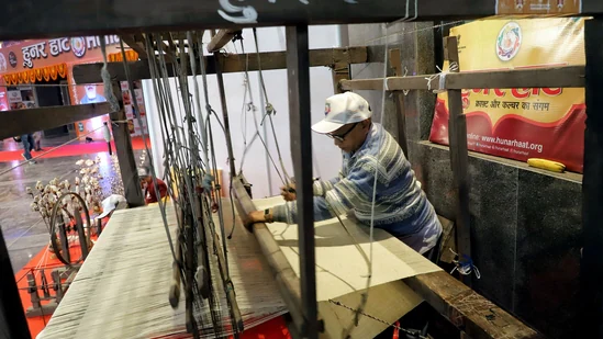 A man weaves inside a stall during inauguration of the 33rd Hunar Haat at the 40th India International Trade Fair at Pragati Maidan in New Delhi.(ANI)