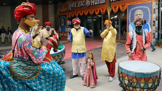 Artists perform a puppet show during the inauguration of the 33rd Hunar Haat at the 40th India International Trade Fair at Pragati Maidan in New Delhi.(ANI)