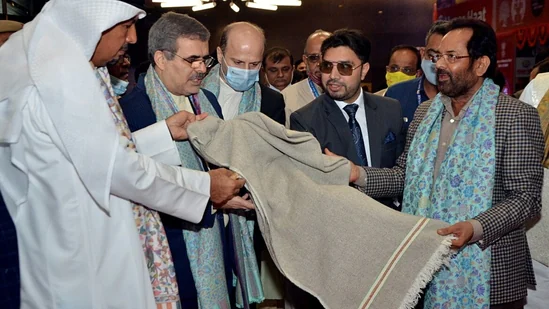 Union Minority Affairs Minister Mukhtar Abbas Naqvi with Iran Ambassador to India H.E. Dr. Ali Chegeni and Ambassador of Kuwait to India Jasem Ibrahem Al Najem attend the inauguration of the 33rd Hunar Haat at the 40th India International Trade Fair at Pragati Maidan in New Delhi.(ANI)