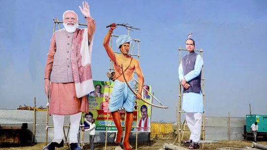 Huge cutouts of Prime Minister Narendra Modi, Tribal leader Birsa Munda and Madhya Pradesh Chief Minister Shivraj Singh Chouhan were displayed on the streets for Tribal Pride Day celebration ahead of PM Modi’s visit at Jamboree ground, in Bhopal.(PTI)