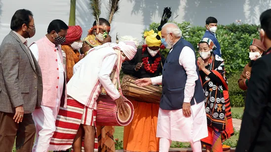 Prime Minister Narendra Modi interacts with a drummer during the ceremony. “India marks Janjatiya Gaurav Divas today. We recall the great Bhagwan Birsa Munda and reiterate our commitment to ensuring even greater progress for our tribal communities.,” PM Modi tweeted.(PTI)