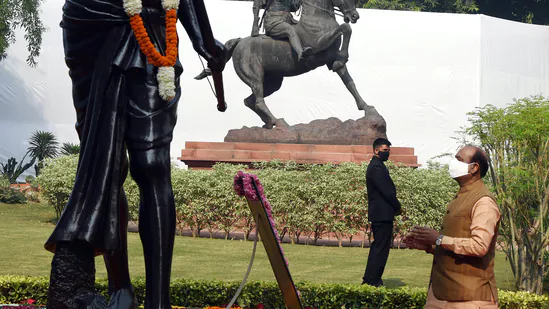 Lok Sabha Speaker Om Birla pays tribute to tribal leader Birsa Munda on his birth anniversary at the Parliament, in New Delhi on November 15.(PTI)